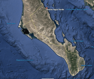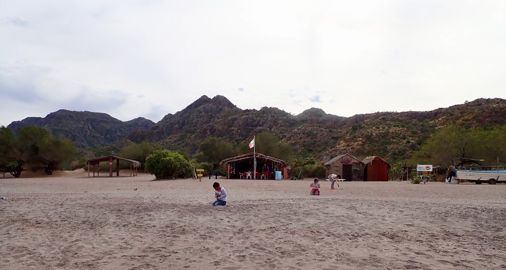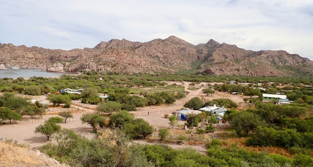 2.16 We stayed in this bay for a number of days. It had everything- mountains, beaches, turquoise waters (“agua verde”) a tiny store and village, a delightful palapa restaurant on the beach, ancient cave paintings on the next headland, a natural palm oasis….