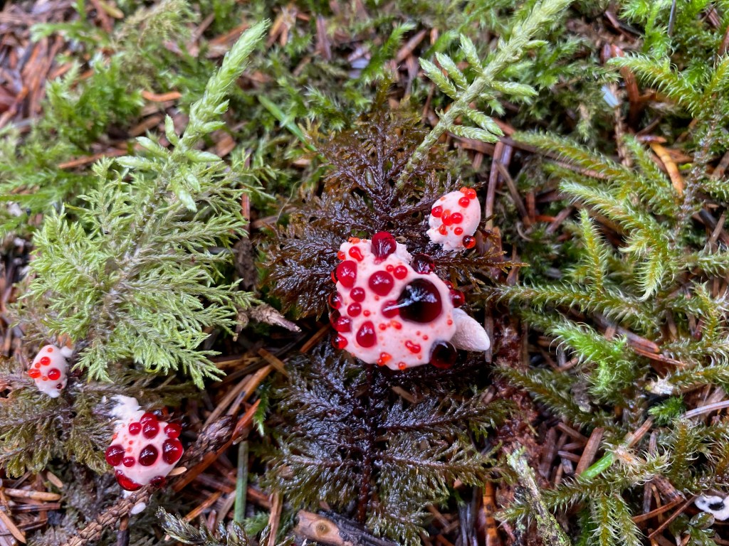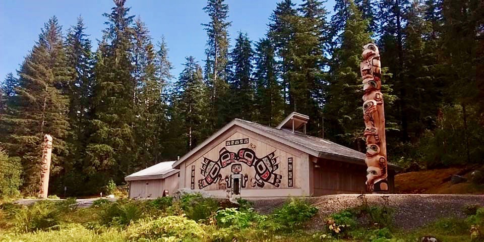 There are lots of delightful trails around the cove even though most facilities were closed due to Covid. There is a beautiful Tlingit Meeting house, totem poles, a full skeleton of a humpback whale ( tragically killed by a cruise ship) and an ancient Tlingit handmade canoe. We spent a day reading up on the geology and history of the cove, hiking and exploring with Abigail. The mushrooms everywhere were astonishing. We were all a bit nervous about meeting bears when we got deeper into the woods and did a lot of singing. I met ( from a safe distance) a black mama bear and two babies while walking by myself. This was our first sighting of black bears as there are none on Baranof Island.