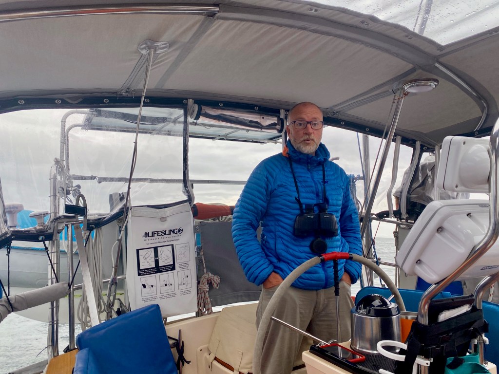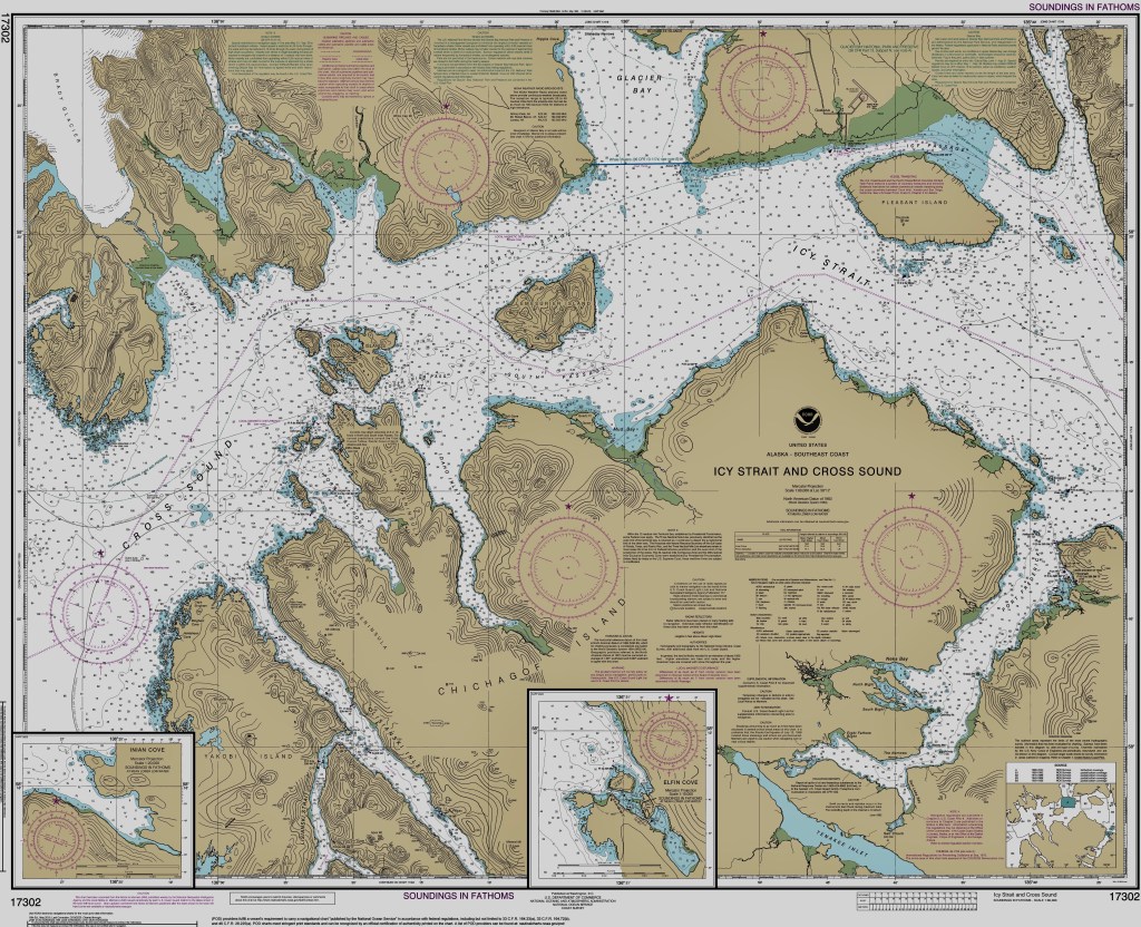 Our route, with Paul up and running and on the helm, takes us north through Olga and Neva Straits, offshore to Cross Sound and then back inshore and east through Icy Straits to Gustavus and Bartlett Cove at the park.