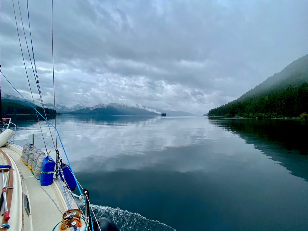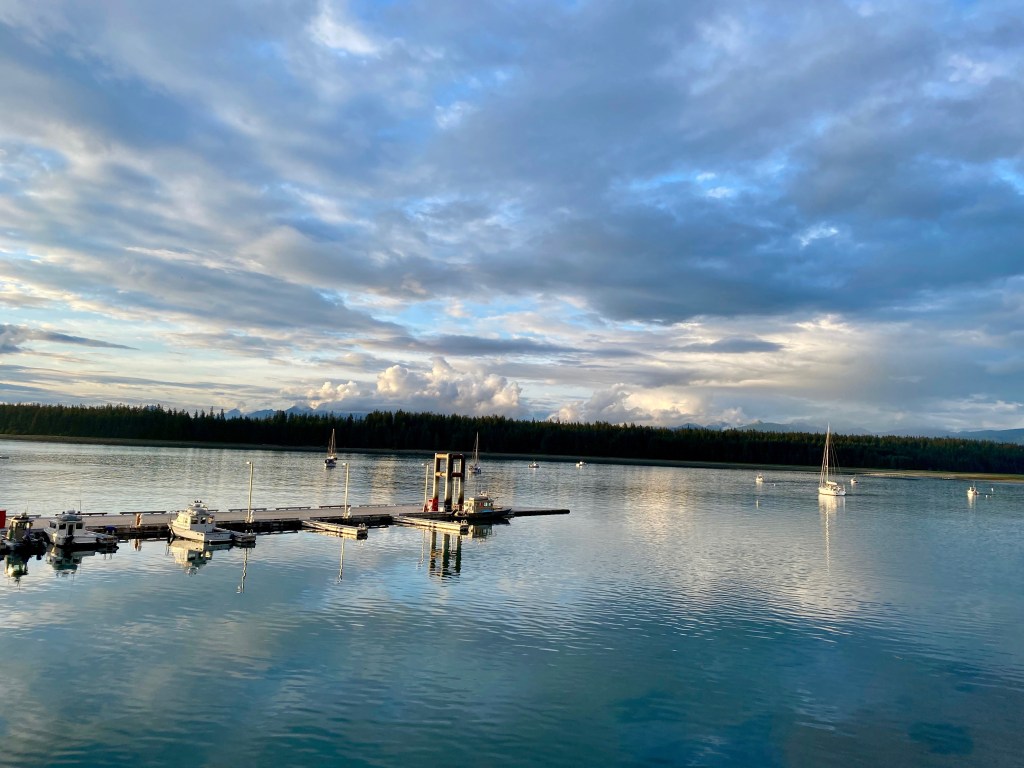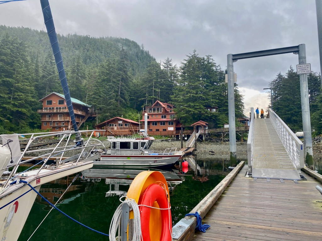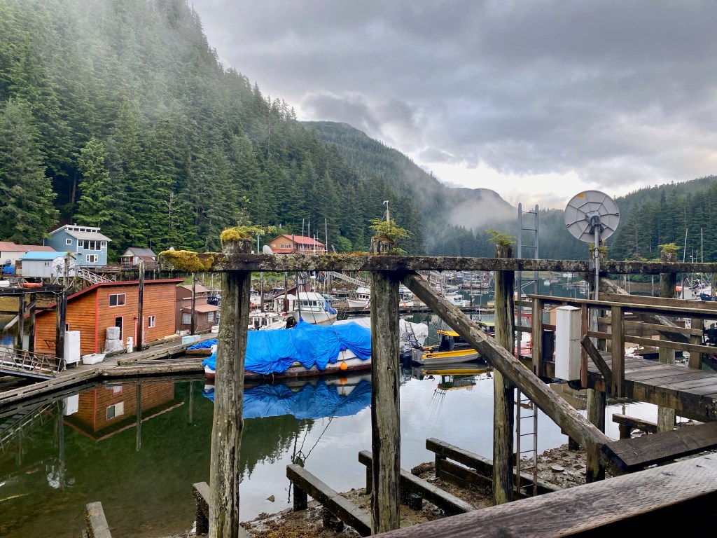 The next night we stayed in Elfin Cove, also on Chichagof Island. Elfin Cove is perfectly named; a tiny magical community of boardwalks, colorful fishing vessels and cedar homes surrounded by vast forest and myriads of islands. In the winter the population goes down to 6, and in the summer I believe it is around 60. Far across the water we could see Brady Glacier when the mists lifted. Brady Glacier is part of the Glacier Bay Park where we are headed; the largest marine park in the world and a UNESCO world heritage site. When we arrived on Elfin Cove’s tiny dock, a few fishermen greeted us warmly. We thought they might dismiss us as yachties but they were super friendly and we spent a long time chatting with them and left the next morning with gifts of smoked salmon and giant prawns.