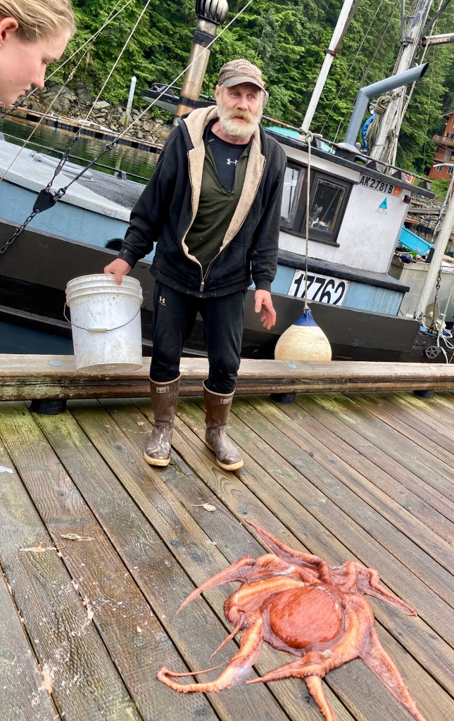 As it turned out and as he was eager for us to know the next morning, he gave it fresh sea water, waited for it to turn a deep calm shade of purple, and then released it into the ocean. He told us that while he was washing his boat down, every time he turned around it was watching him. He described the journey he imagined it would take heading back to its rocky ledge past ravenous sea lions. He also told us about the local Orca pod and the resident bull, a big old whale with particular colorings and many “wives, children and grandchildren” He told us “me and the bull have been fishing these waters together for 30 years…..”